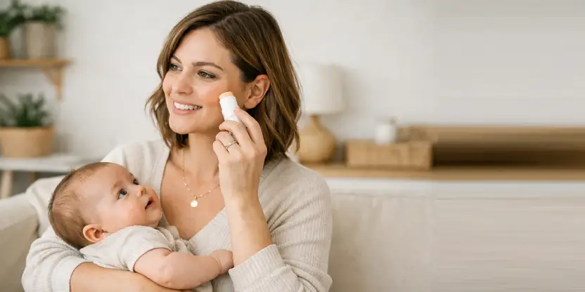 The ideal skincare for new moms during a nap includes a facial mist, a treatment stick or serum, and an oil or moisturizer in easy packaging. This combination refreshes, nourishes, and protects the skin in just a few minutes.